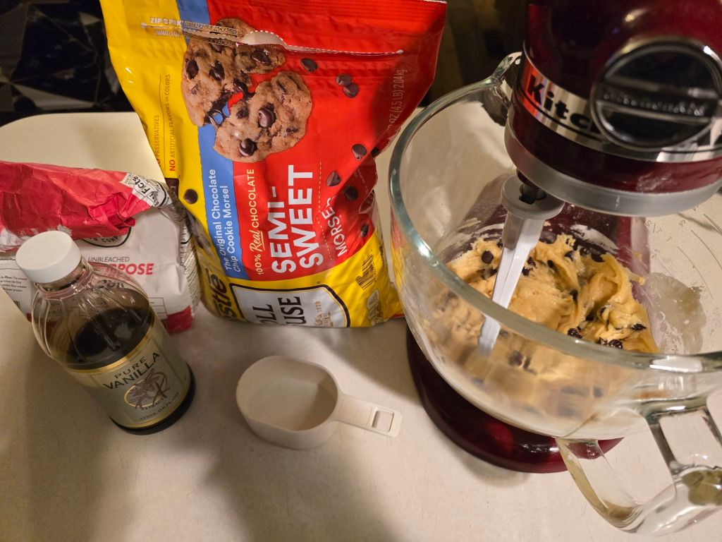 So after a two hour AARP nap I woke up with a craving for a snack. “Can’t buy any store made cakes”! It’s like 7:45pm Sunday evening and no way is “she” gonna bake anything. So I take it personal. Challenge accepted. So today was my first attempt at chocolate chip cookies. 8pm. Done by 8:30pm. Not pretty but taste better than expected. Altered the ingredients slightly. And one big benefit of baking them myself: I had a few extra chips “on the side”.